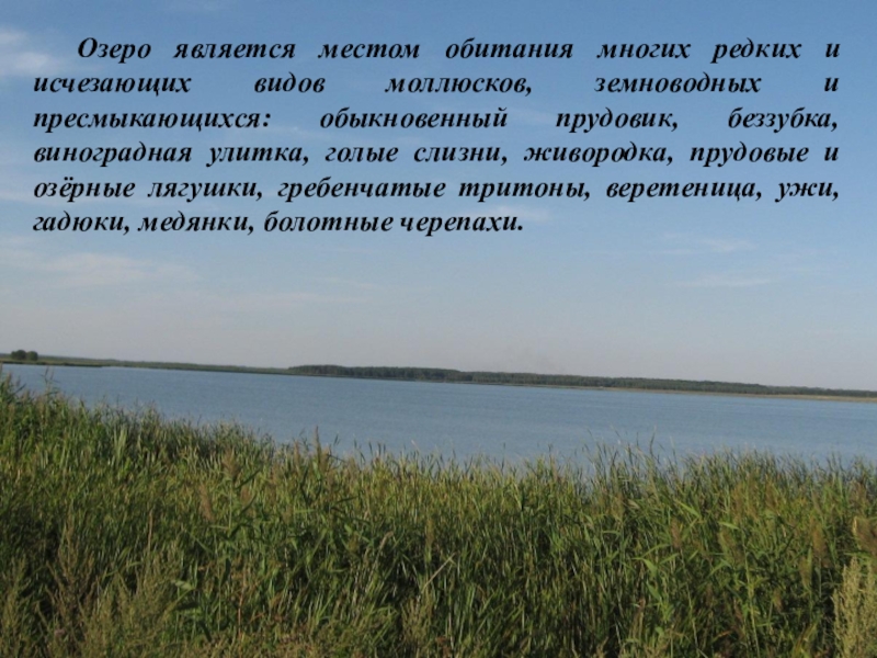 Слайд 10 Озеро является местом обитания многих редких и исчезающих видов моллюсков, земноводных