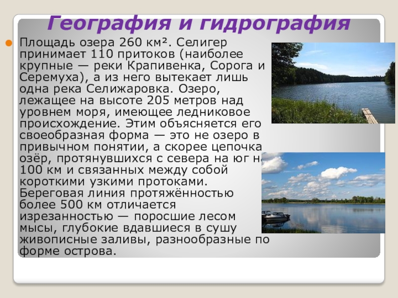 крупные — реки Крапивенка, Сорога и Серемуха), а из него вытекает лишь одна река Селижаровка. Озеро, лежащее на высоте 205 метров над уровнем моря, имеющее ледниковое происхождение. Этим объясняется его своеобразная форма — это не озеро в привычном понятии, а скорее цепочка озёр, протянувшихся с севера на юг на 100 км и связанных между собой короткими узкими протоками. Береговая линия протяжённостью более 500 км отличается изрезанностью — поросшие лесом мысы, глубокие вдавшиеся в сушу живописные заливы, разнообразные по форме острова.