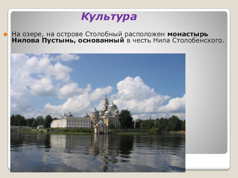 На озере, на острове Столобный расположен монастырь Нилова Пустынь, основанный в