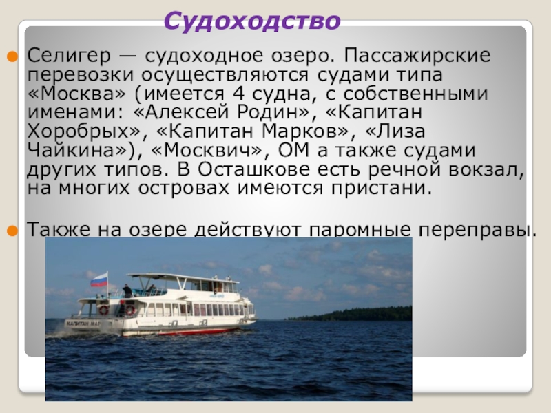 Селигер — судоходное озеро. Пассажирские перевозки осуществляются судами типа «Москва» (имеется