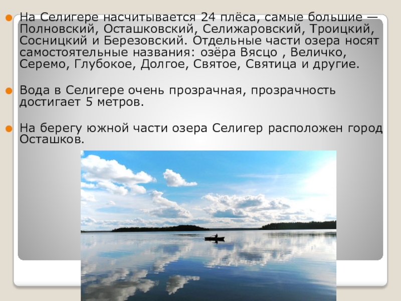 На Селигере насчитывается 24 плёса, самые большие — Полновский, Осташковский,