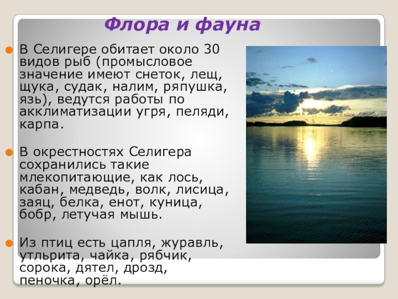 В Селигере обитает около 30 видов рыб (промысловое значение