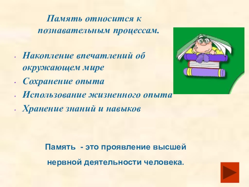 Память - это проявление высшей нервной деятельности человека.