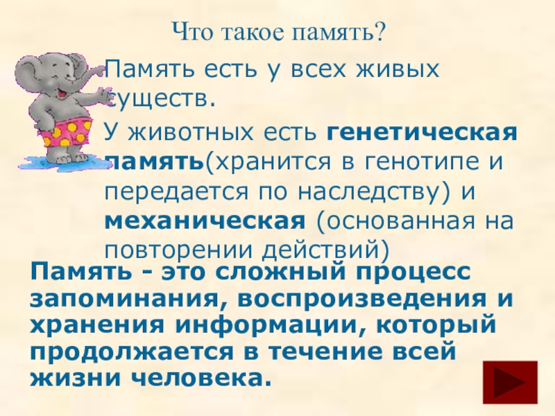 Память - это сложный процесс запоминания, воспроизведения и хранения информации, который продолжается в течение всей жизни человека.