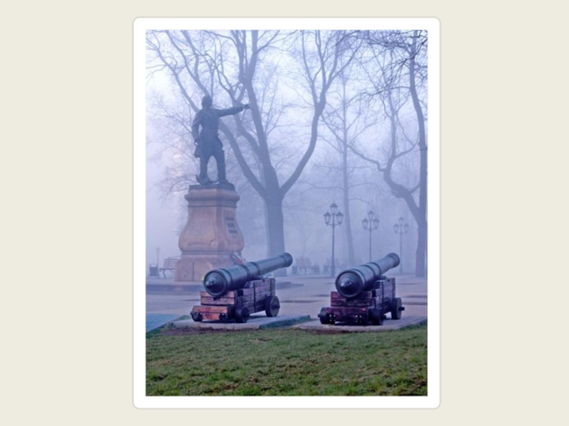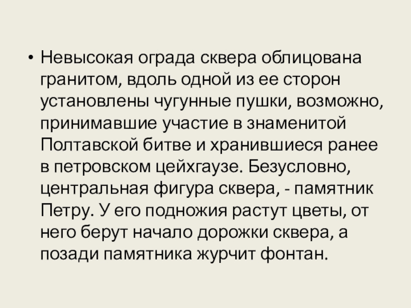 чугунные пушки, возможно, принимавшие участие в знаменитой Полтавской битве и хранившиеся ранее в петровском цейхгаузе. Безусловно, центральная фигура сквера, - памятник Петру. У его подножия растут цветы, от него берут начало дорожки сквера, а позади памятника журчит фонтан.