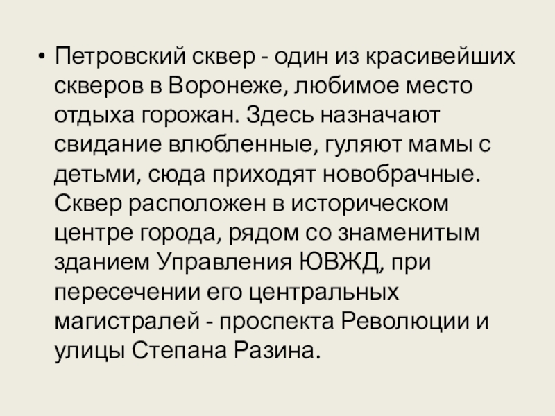 Петровский сквер - один из красивейших скверов в Воронеже, любимое место отдыха горожан. Здесь назначают свидание влюбленные, гуляют мамы с детьми, сюда приходят новобрачные. Сквер расположен в историческом центре города, рядом со знаменитым зданием Управления ЮВЖД,