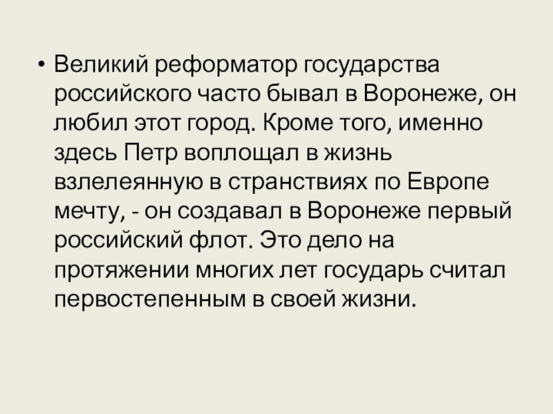 город. Кроме того, именно здесь Петр воплощал в жизнь взлелеянную в странствиях по Европе мечту, - он создавал в Воронеже первый российский флот. Это дело на протяжении многих лет государь считал первостепенным в своей жизни.