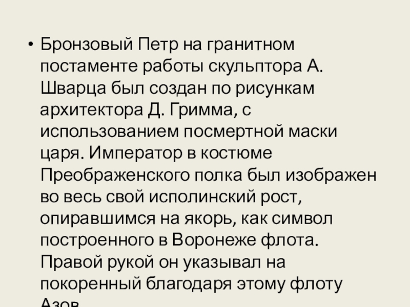 Бронзовый Петр на гранитном постаменте работы скульптора А. Шварца был создан по рисункам архитектора Д. Гримма, с