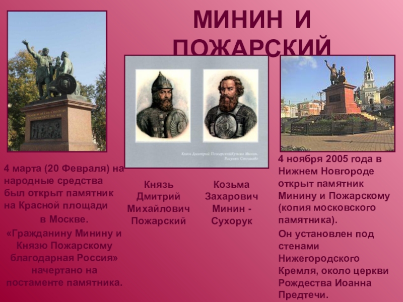4 ноября 2005 года в Нижнем Новгороде открыт памятник Минину и Пожарскому (копия московского памятника).