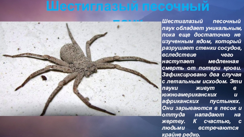 изученным ядом, который разрушает стенки сосудов, вследствие чего наступает медленная смерть от потери крови. Зафиксировано два случая с летальным исходом. Эти пауки живут в южноамериканских и африканских пустынях. Они зарываются в песок и оттуда нападают на жертву. К счастью, с людьми встречаются крайне редко.