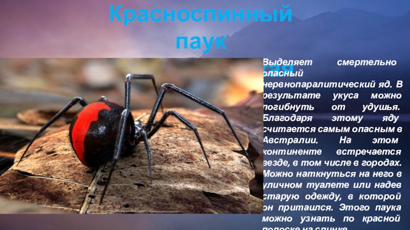 можно погибнуть от удушья. Благодаря этому яду считается самым опасным в Австралии. На этом континенте встречается везде, в том числе в городах. Можно наткнуться на него в уличном туалете или надев старую одежду, в которой он притаился. Этого паука можно узнать по красной полоске на спинке.