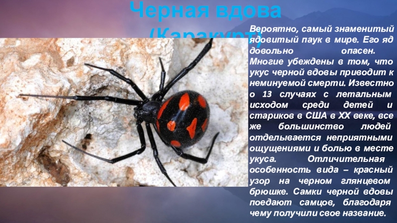 Многие убеждены в том, что укус черной вдовы приводит к неминуемой смерти. Известно о 13 случаях с летальным исходом среди детей и стариков в США в ХХ веке, все же большинство людей отделывается неприятными ощущениями и болью в месте укуса. Отличительная особенность вида – красный узор на черном глянцевом брюшке. Самки черной вдовы поедают самцов, благодаря чему получили свое название.