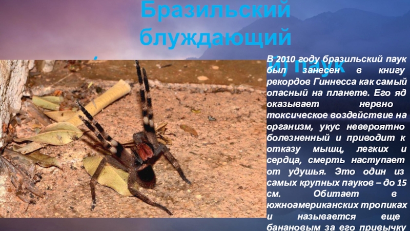 книгу рекордов Гиннесса как самый опасный на планете. Его яд оказывает нервно токсическое воздействие на организм, укус невероятно болезненный и приводит к отказу мышц, легких и сердца, смерть наступает от удушья. Это один из самых крупных пауков – до 15 см. Обитает в южноамериканских тропиках и называется еще банановым за его привычку прятаться в банановых листьях.