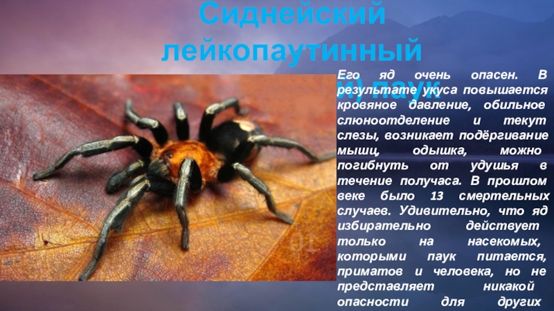 Вероятно, самый знаменитый ядовитый паук в мире. Его яд