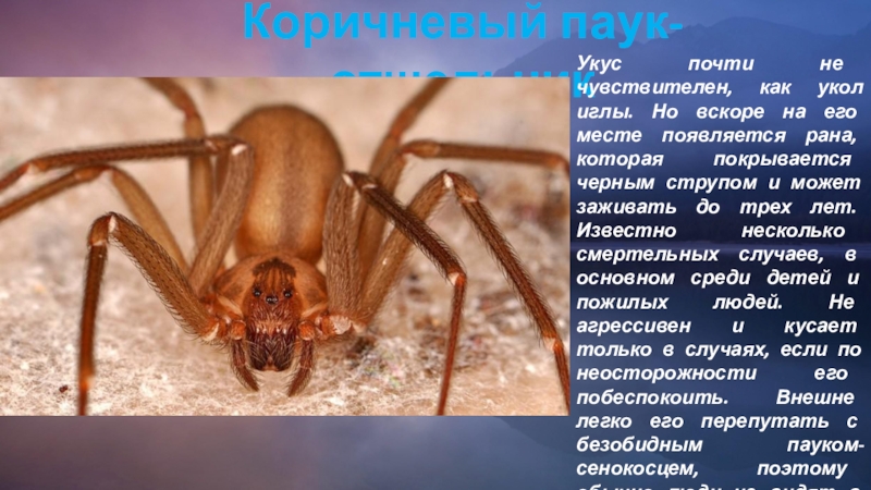 Считается самым опасным среди пауков-отшельников. В результате действия его яда
