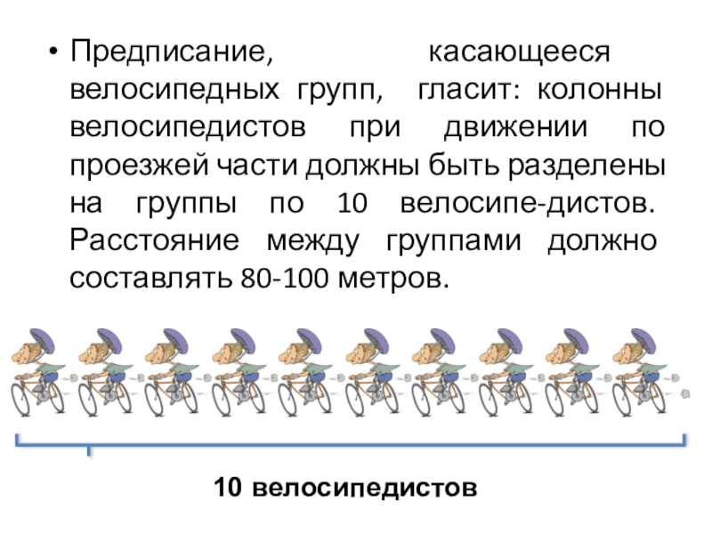 Слайд 9Предписание, касающееся велосипедных групп, гласит: колонны велосипедистов при движении по проезжей