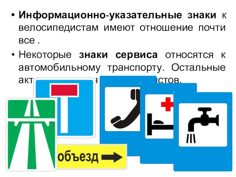 Слайд 15Информационно-указательные знаки к велосипедистам имеют отношение почти все .