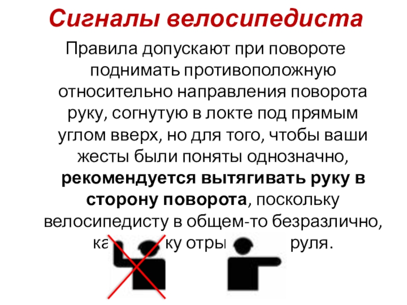 согнутую в локте под прямым углом вверх, но для того, чтобы ваши жесты были поняты однозначно, рекомендуется вытягивать руку в сторону поворота, поскольку велосипедисту в общем-то безразлично, какую руку отрывать от руля.