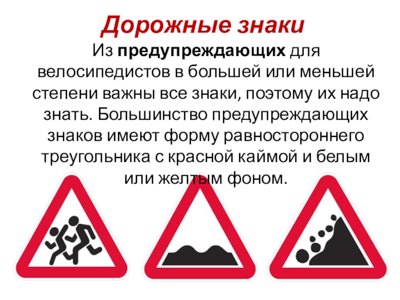 степени важны все знаки, поэтому их надо знать. Большинство предупреждающих знаков имеют форму равностороннего треугольника с красной каймой и белым или желтым фоном.