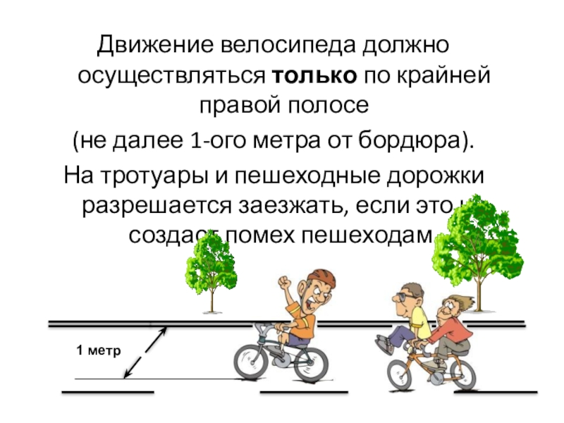Слайд 4Движение велосипеда должно осуществляться только по крайней правой полосе