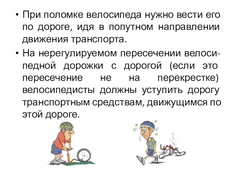 Слайд 8При поломке велосипеда нужно вести его по дороге, идя в попутном