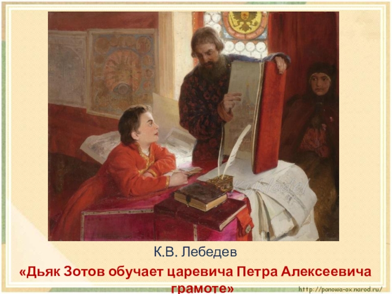 «Дьяк Зотов обучает царевича Петра Алексеевича грамоте»