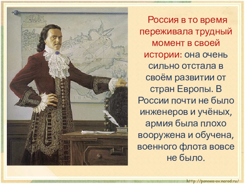 очень сильно отстала в своём развитии от стран Европы. В России почти не было инженеров и учёных, армия была плохо вооружена и обучена, военного флота вовсе не было.
