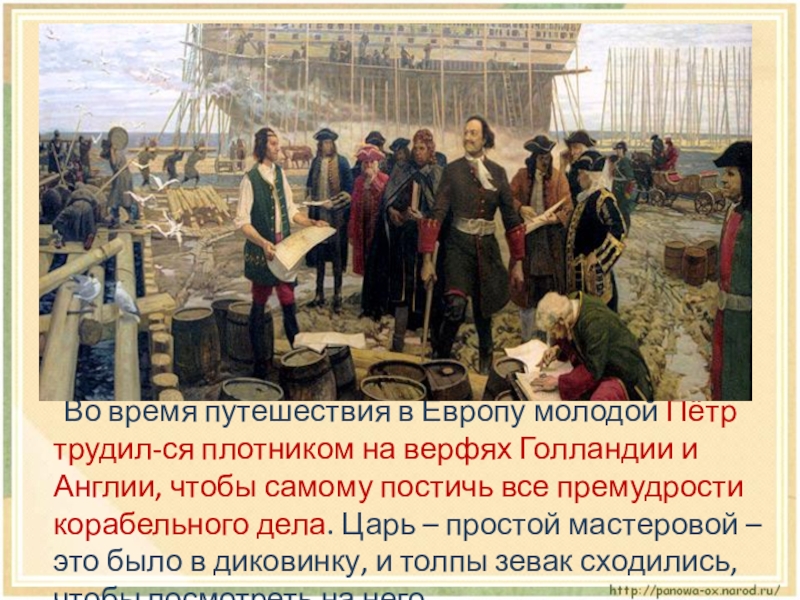 Слайд 10 Во время путешествия в Европу молодой Пётр трудил-ся плотником на верфях