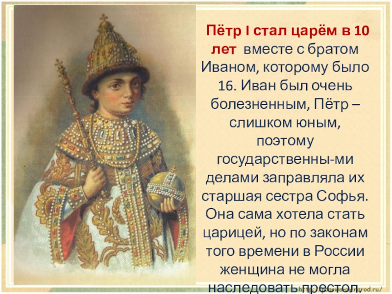 которому было 16. Иван был очень болезненным, Пётр – слишком юным, поэтому государственны-ми делами заправляла их старшая сестра Софья. Она сама хотела стать царицей, но по законам того времени в России женщина не могла наследовать престол.