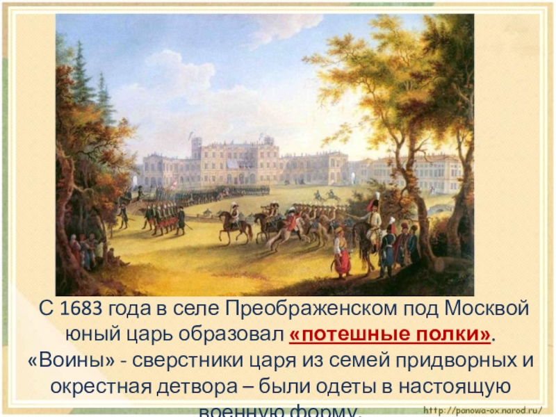 Слайд 6 С 1683 года в селе Преображенском под Москвой юный царь образовал