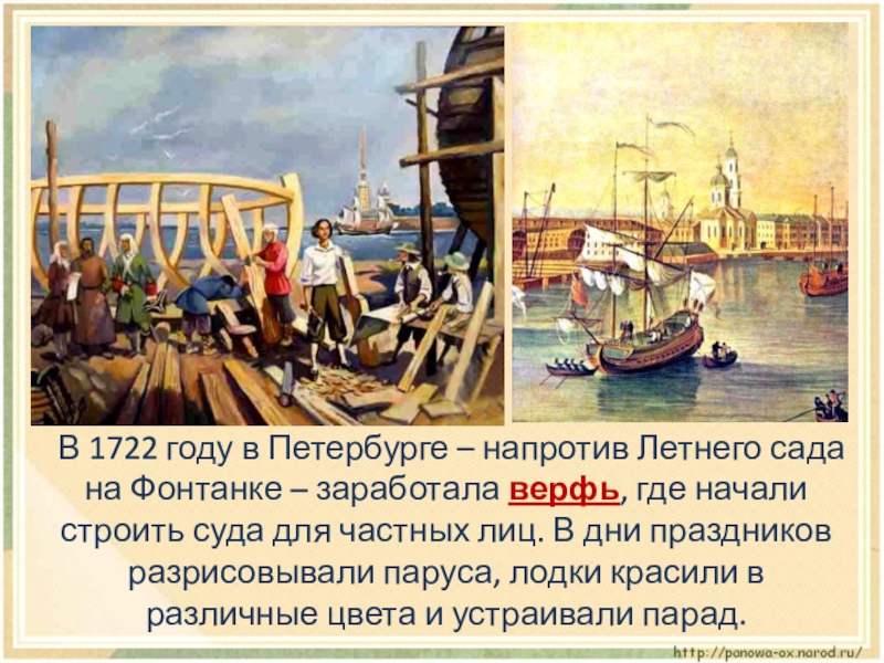 – заработала верфь, где начали строить суда для частных лиц. В дни праздников разрисовывали паруса, лодки красили в различные цвета и устраивали парад.