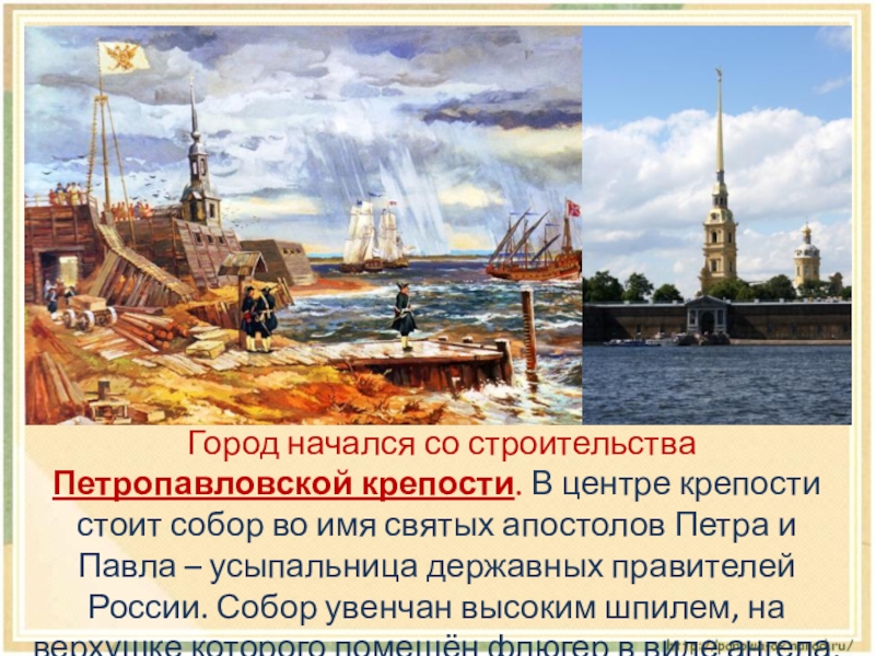 Слайд 21 Город начался со строительства Петропавловской крепости. В центре крепости стоит собор