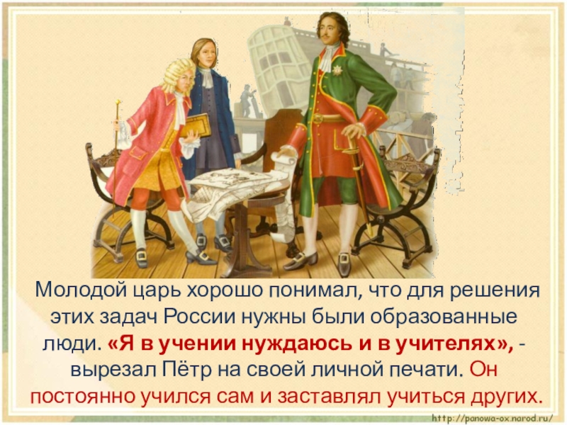 были образованные люди. «Я в учении нуждаюсь и в учителях», - вырезал Пётр на своей личной печати. Он постоянно учился сам и заставлял учиться других.