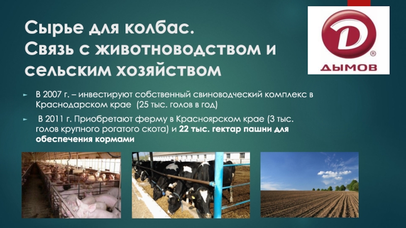 В 2007 г. – инвестируют собственный свиноводческий комплекс в Краснодарском крае (25 тыс. голов в год)