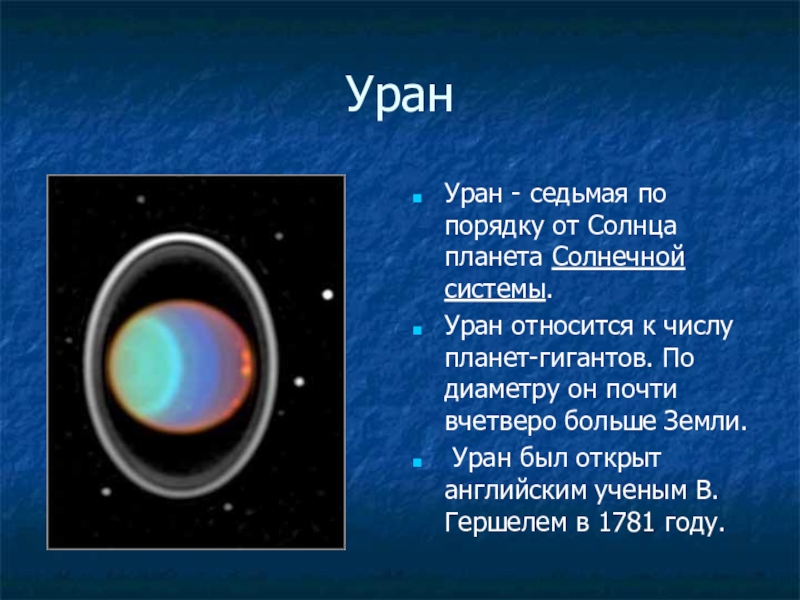 УранУран - седьмая по порядку от Солнца планета Солнечной системы. Уран относится к числу планет-гигантов. По диаметру