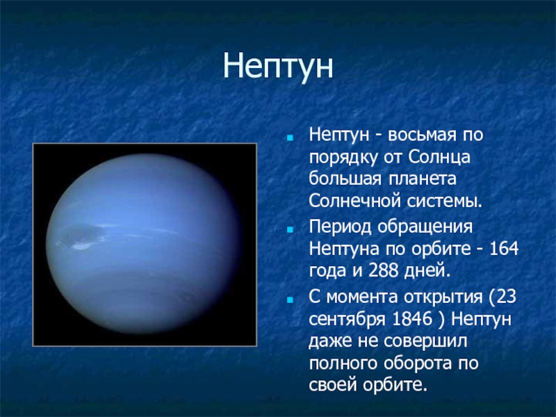 НептунНептун - восьмая по порядку от Солнца большая планета Солнечной системы. Период обращения Нептуна по орбите -