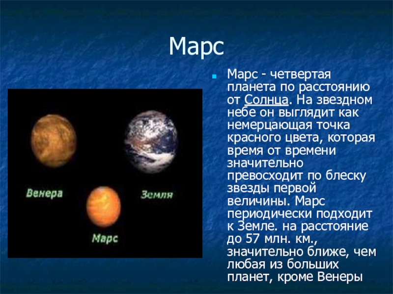 МарсМарс - четвертая планета по расстоянию от Солнца. На звездном небе он выглядит как немерцающая точка красного