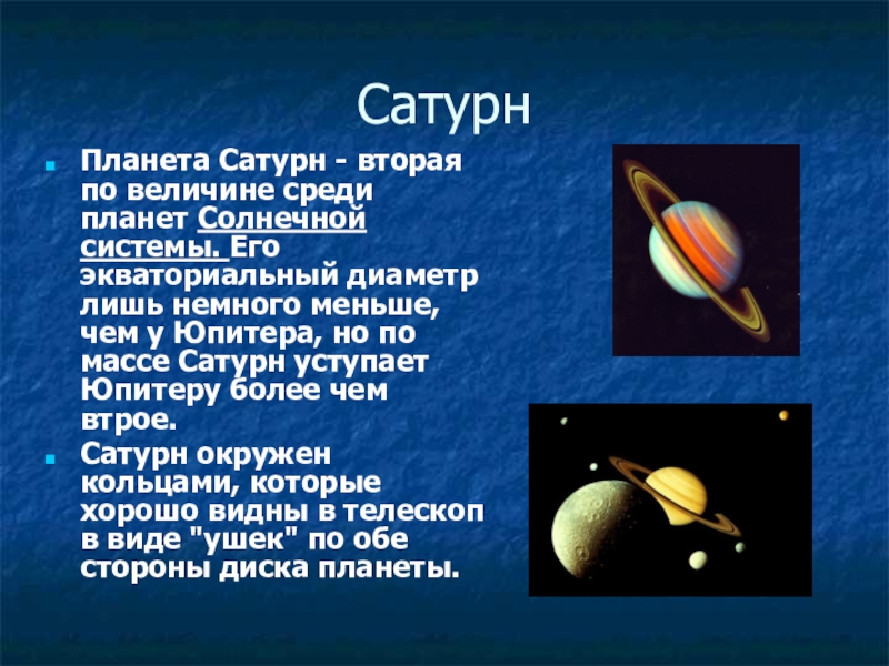 СатурнПланета Сатурн - вторая по величине среди планет Солнечной системы. Его экваториальный диаметр лишь немного меньше, чем