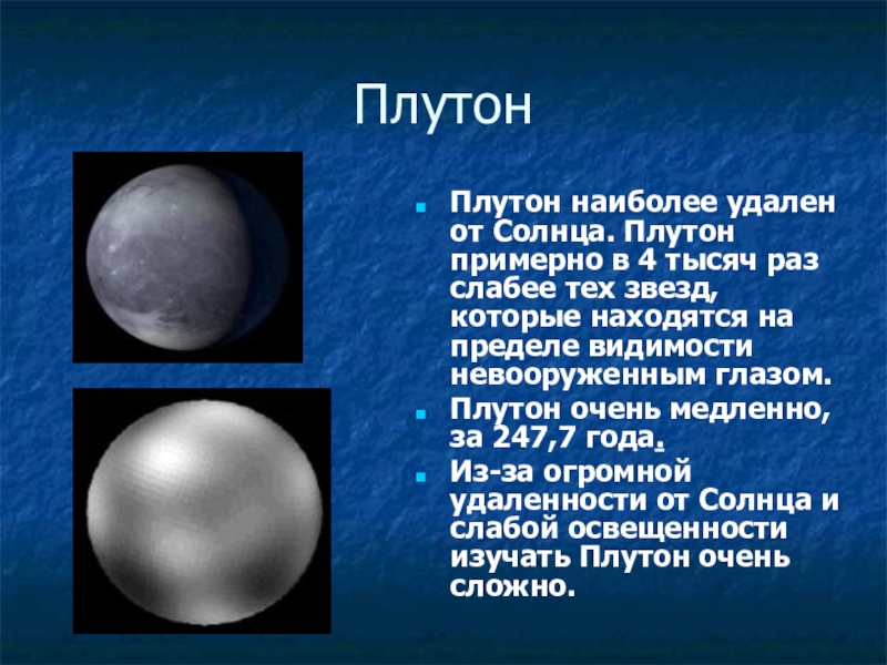 ПлутонПлутон наиболее удален от Солнца. Плутон примерно в 4 тысяч раз слабее тех звезд, которые находятся на