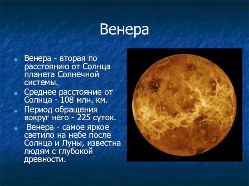 ВенераВенера - вторая по расстоянию от Солнца планета Солнечной системы. Среднее расстояние от Солнца - 108 млн.