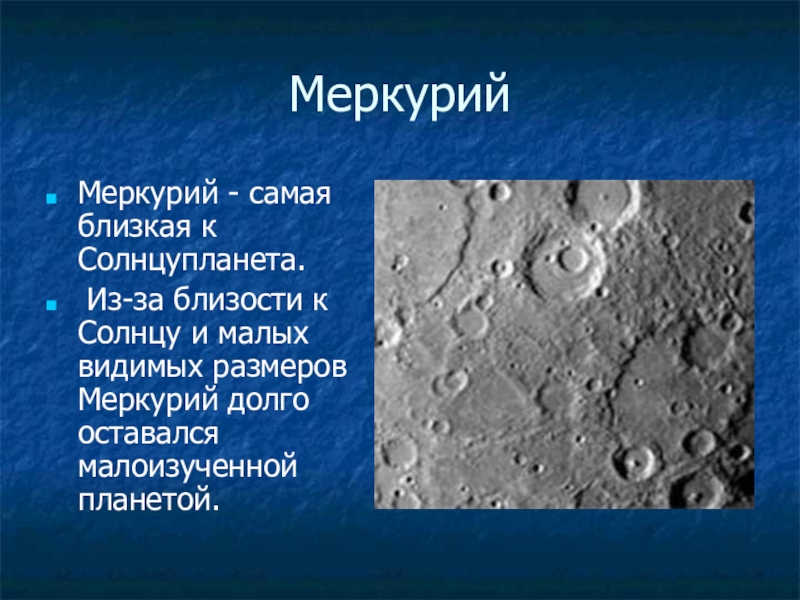 МеркурийМеркурий - самая близкая к Солнцупланета. Из-за близости к Солнцу и малых видимых размеров Меркурий долго оставался малоизученной планетой.