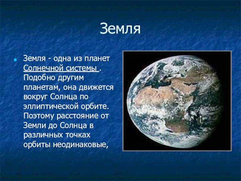 ЗемляЗемля - одна из планет Солнечной системы . Подобно другим планетам, она движется вокруг Солнца по эллиптической