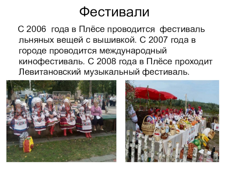 Фестивали  С 2006 года в Плёсе проводится фестиваль льняных вещей с вышивкой. С 2007 года в