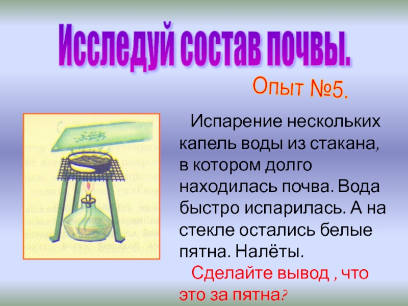 Это сгорает перегной, который образуется из остатков растений и животных. Именно перегной придаёт почве тёмный цвет. Плодородие почвы определяется количеством в ней перегноя.