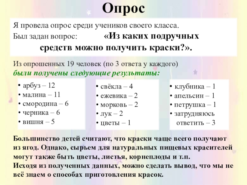Исходя из полученных данных, можно сделать вывод, что мы не всё знаем о способах приготовления красок.