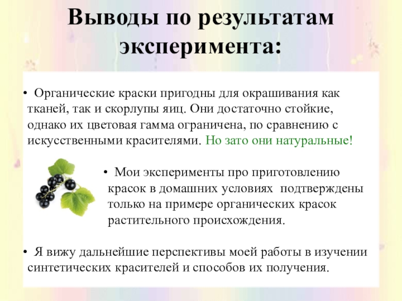 Большинство детей считают, что краски чаще всего получают из ягод. Однако, сырьем для натуральных пищевых красителей могут также быть цветы, листья, корнеплоды и т.п.