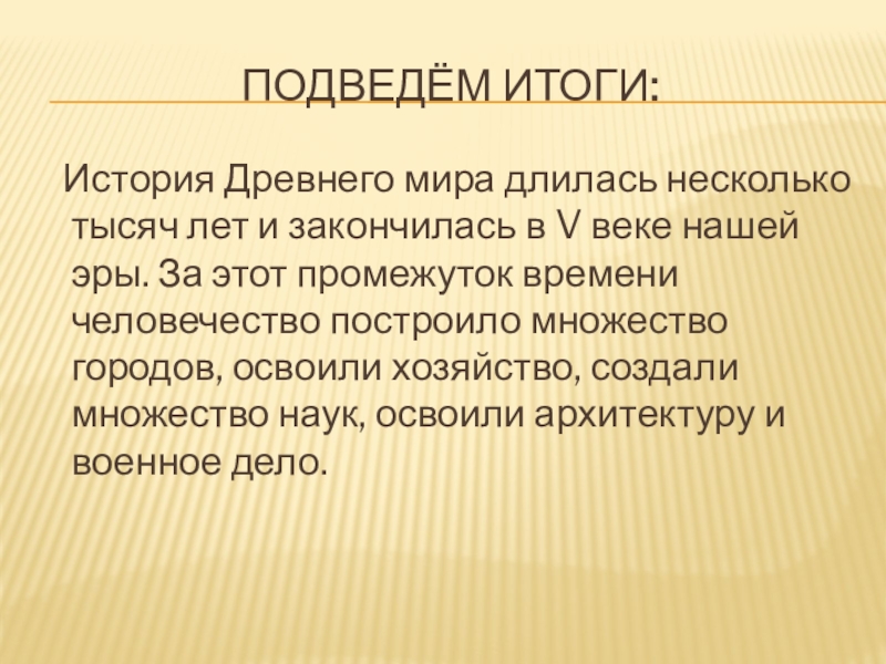 закончилась в V веке нашей эры. За этот промежуток времени человечество построило множество городов, освоили хозяйство, создали множество наук, освоили архитектуру и военное дело.