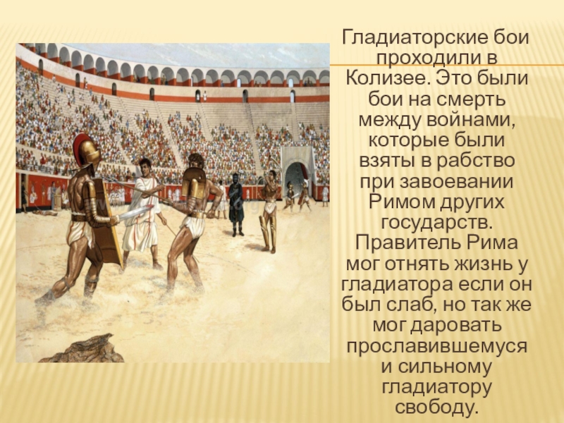смерть между войнами, которые были взяты в рабство при завоевании Римом других государств. Правитель Рима мог отнять жизнь у гладиатора если он был слаб, но так же мог даровать прославившемуся и сильному гладиатору свободу.