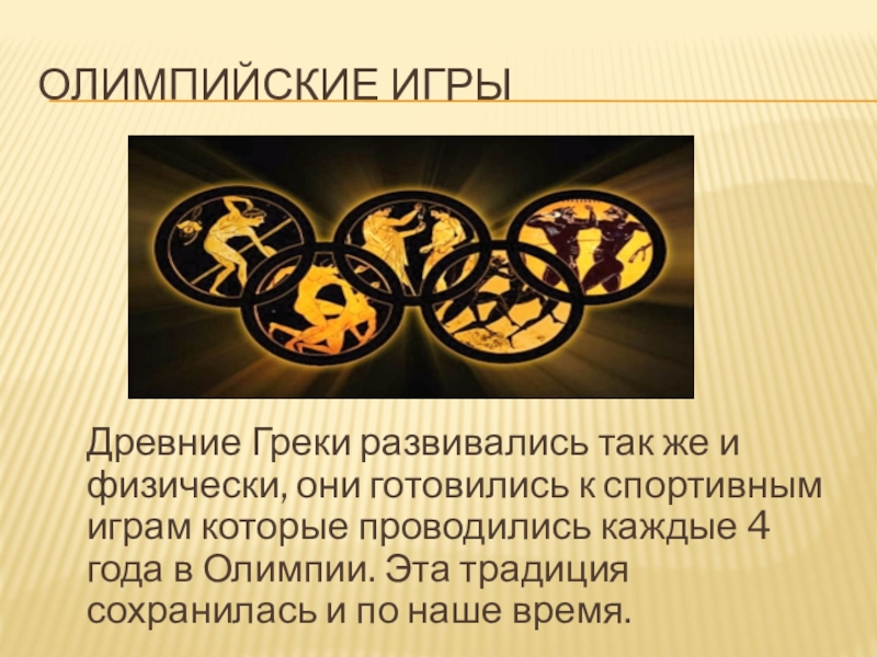 готовились к спортивным играм которые проводились каждые 4 года в Олимпии. Эта традиция сохранилась и по наше время.