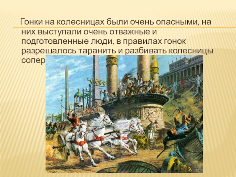 Слайд 17 Гонки на колесницах были очень опасными, на них выступали